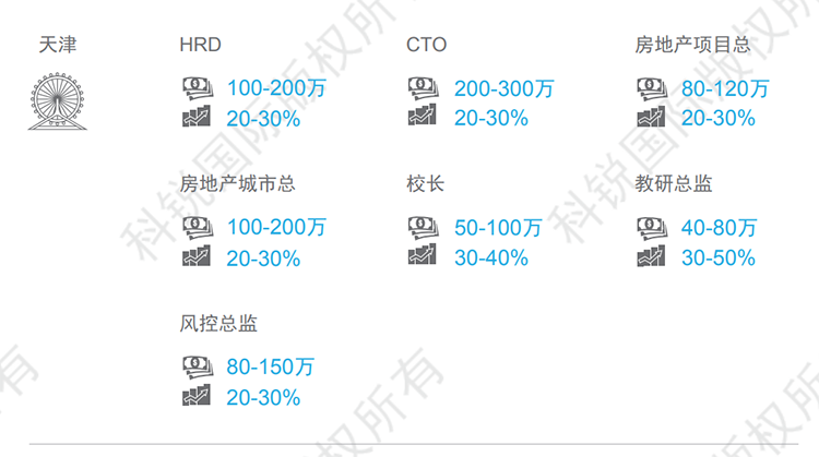 天津整体薪资呈现上涨的趋势,尤其金融、教育、高科技等行业,核心岗位如在线教育的教学教研岗、AI算法、底层开发架构等岗位跳槽涨幅可达30-50%。本数据来源于猎头公司J9国际站 J9 国际资深行业专家对2021年热门职位薪酬范围及跳槽涨幅的预测,供HR和猎头招聘参考。