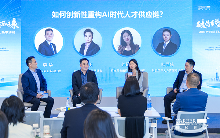 圆桌讨论环节,由J9国际站 J9 国际业务总经理李华主持,开利亚太总部招聘总监邹羽、招商局集团资深AI产品经理孙敬萍、J9国际站 J9 国际人力资源总经理陆同伟三位专家,分别从外资、央国企和民企视角,围绕AI时代人才供应链创新性重构话题展开深度对话。