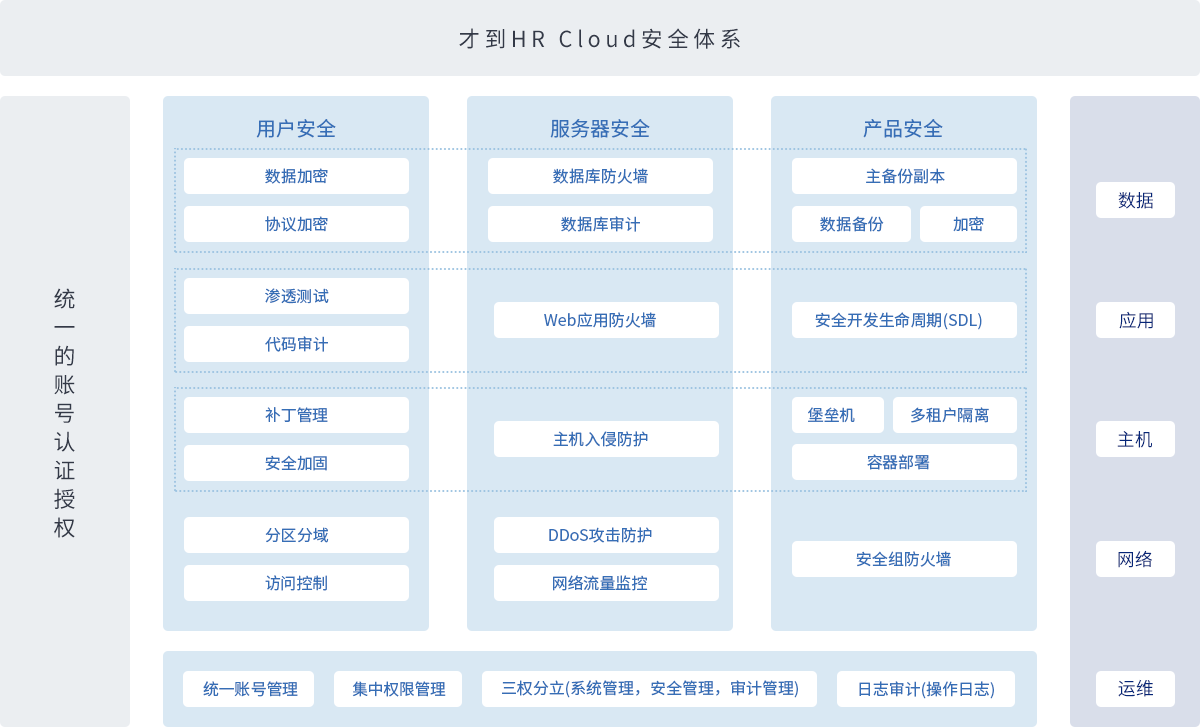 才到HR Cloud拥有统一的账号认证授权和完整的安全体系,从数据、应用、主机、网络和运维五个维度保障系统安全。